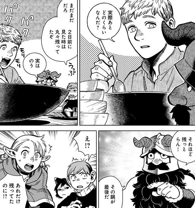 ライオスだけは、まだまだ食べれるようで涼しい顔でファリゴンのクリーム煮に残っている料理を食べていきます。そしてファリンの竜部分を使った料理は、センシが持ってきたファリゴンのクリーム煮で最後です。まだまだ料理が残っていると思っていたマルシルやチルチャックは、この鍋で最後と聞き安心します。まだまだファリンの竜部分が残っていると思っていたようで、最後のファリゴンのクリーム煮を食べようとします。しかし、ファリゴンのクリーム煮はライオスが完食してしまいます。