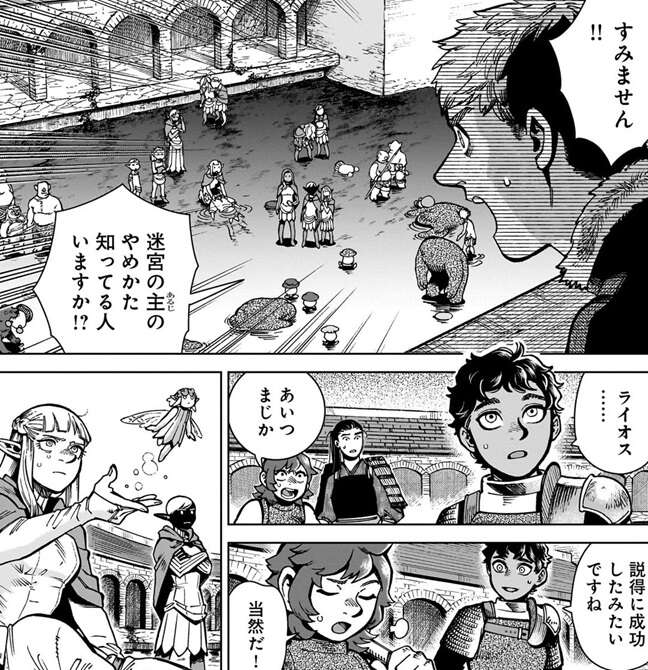 マルシルの説得に成功したライオス達は、マルシルに魔物の軍勢を止めてもらおうとしますが、翼獅子が邪魔をして魔物の軍勢は止まりません。仕方なく翼獅子を魔導書に封印する事で、なんとか魔物の軍勢は止まります。その後、このままマルシルが迷宮の主でいるのはまずいという事になり、迷宮の主をやめようとしますが、やめ方が分かりません。