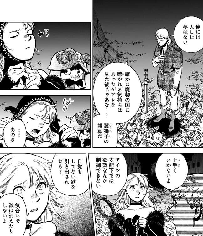 翼獅子に飲み込まれたライオス一行は、翼獅子の記憶の世界で翼獅子と対峙します。ライオスは自分が迷宮の主となり、翼獅子が人間の欲望を叶えられずにはいられないという性質を利用し、悪魔が人間に手出ししない平和な世界を翼獅子に望んで、平和な世界を実現しようとライオスは考えていました。しかしマルシル達は、そんな作戦で上手くいくか?と、懐疑的です。