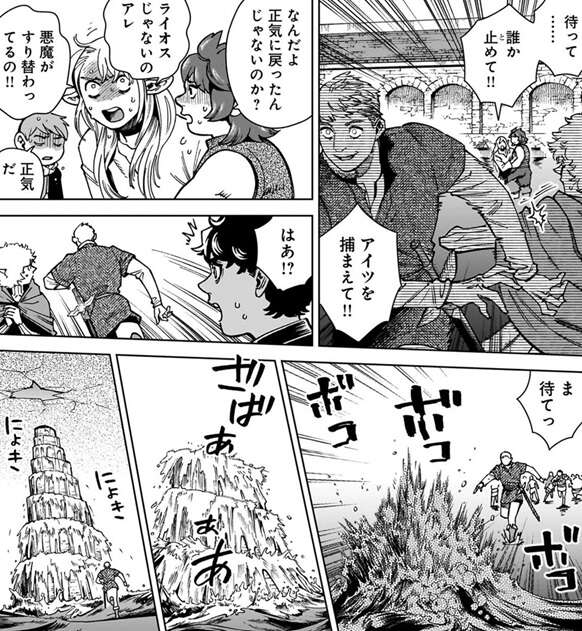 最初はライオスが考えた作戦がいきなり失敗し、ライオスは翼獅子に体を乗っ取られ、悪魔は地上へと出ていきます。しかし、ライオスが望んだ魔物の能力の一つに「欲望を消化することができる」という能力があり、その能力で翼獅子の食欲を消化し、見事翼獅子を撃退します。食欲がなくなり“私”が無くなってしまった翼獅子は消えていきますが、最後にライオスに呪いをかけて消え去ります。翼獅子がかけた呪いは、ライオスが今一番願っている事は決して叶わない、というものですが、ライオスはファリンの事を思い浮かべます。ライオスが思った通り、ファリンの蘇生は叶わぬ願いになるのでしょうか?