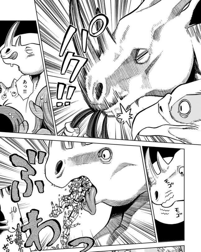 ライオスに食べられても無限に自分を作り出せる翼獅子は、逆にライオスの体を切り刻み食べ始めてしまいます。体の内側にまで侵入されたライオスは血を流して倒れてしまい、翼獅子はライオスの体を捌いて調理しようとします。しかし、翼獅子は自分の中の何かが食われたことに気付き、ライオスに、吐き出せ、と叫びます。