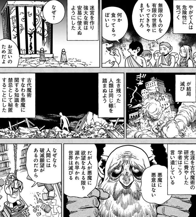 かつて古代人は無限が存在する異界から力を見つけ、その力を魔力と名付けます。やがて力を操る方法、魔術を編み出し、魔術を利用して繫栄していきます。何度も古代人側が魔術を使っていると、魔力側も人間の言語を理解できるようになっていき、それが悪魔となります。やがて人は無限の力の危険性に気付き、迷宮を作って悪魔を閉じ込めます。しかし、結局古代人は滅んでしまいます。生涯を古代魔術の研究に費やした学者は、悪魔に悪意はないが、人間には破滅願望があるので、悪魔に欲望を与える限り遅かれ早かれ世界は滅びる、と言い残したそうです。だから、現代では古代魔術は禁忌とされているのでしょうね。