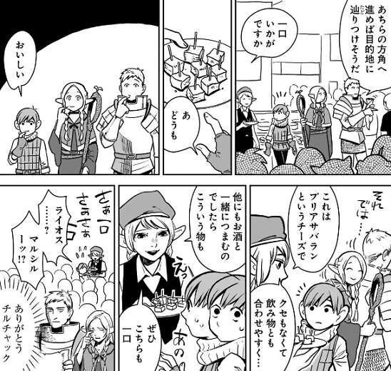 ライオス達が現代のデパ地下に、ファリンの誕生日ケーキを買いに来た、という設定です。目的地のお店まで行くにも、現代人でないライオス達には一苦労のようです。