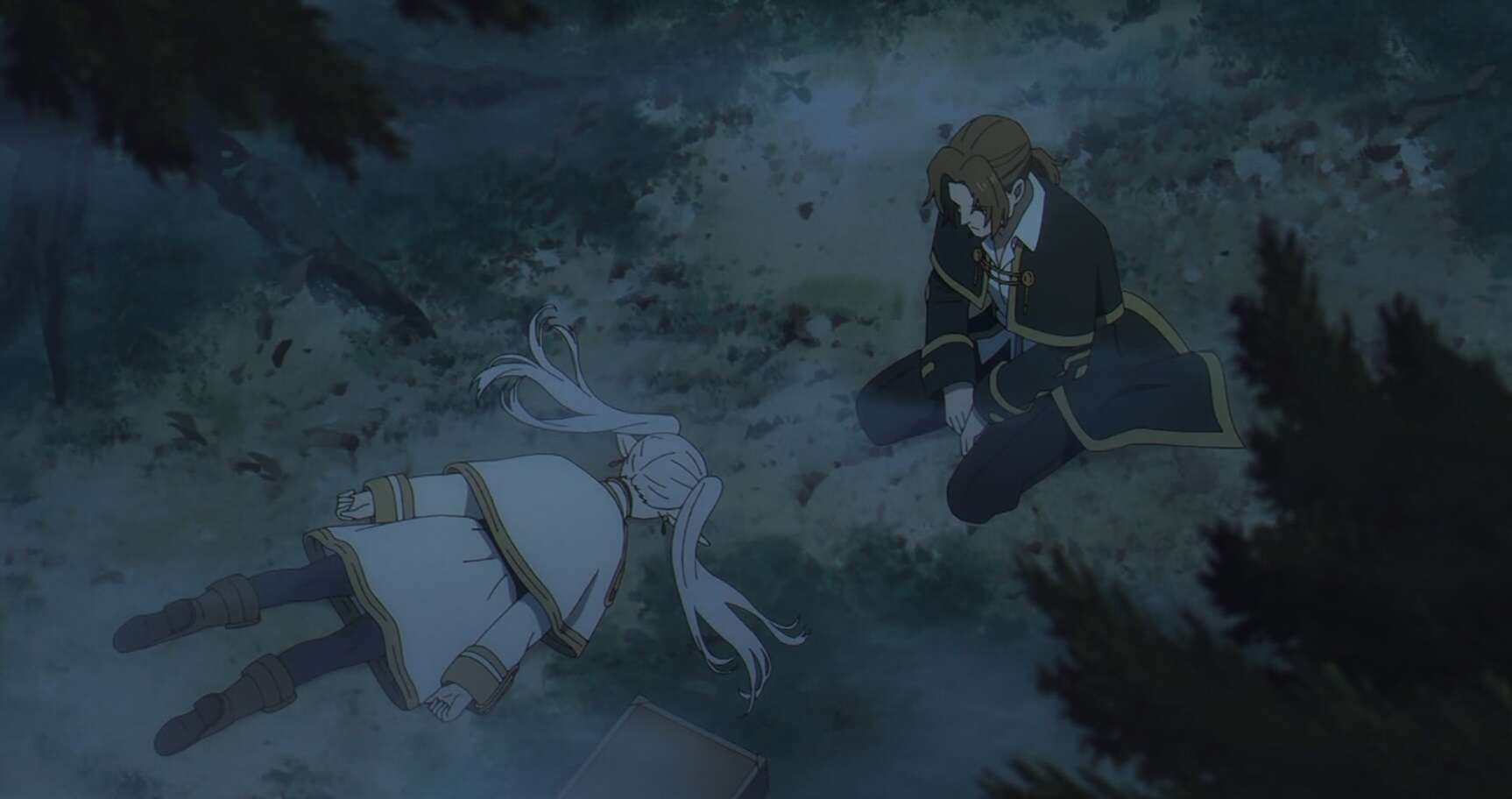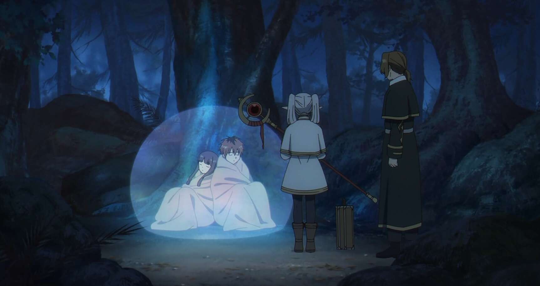 ザインだけは女神の加護と呼ばれる生まれながらの資質があり、呪いには耐性がありますが、他の者には呪いの耐性がなく、さっそくシュタルクが呪いに掛かって眠ってしまいます。眠っているシュタルクを運びながら魔物の場所を目指しますが、途中でフェルンも呪いに掛かって眠ってしまいます。結界を張ってその中に二人を置いていき、フリーレンとザインは二人だけで魔物を目指します。