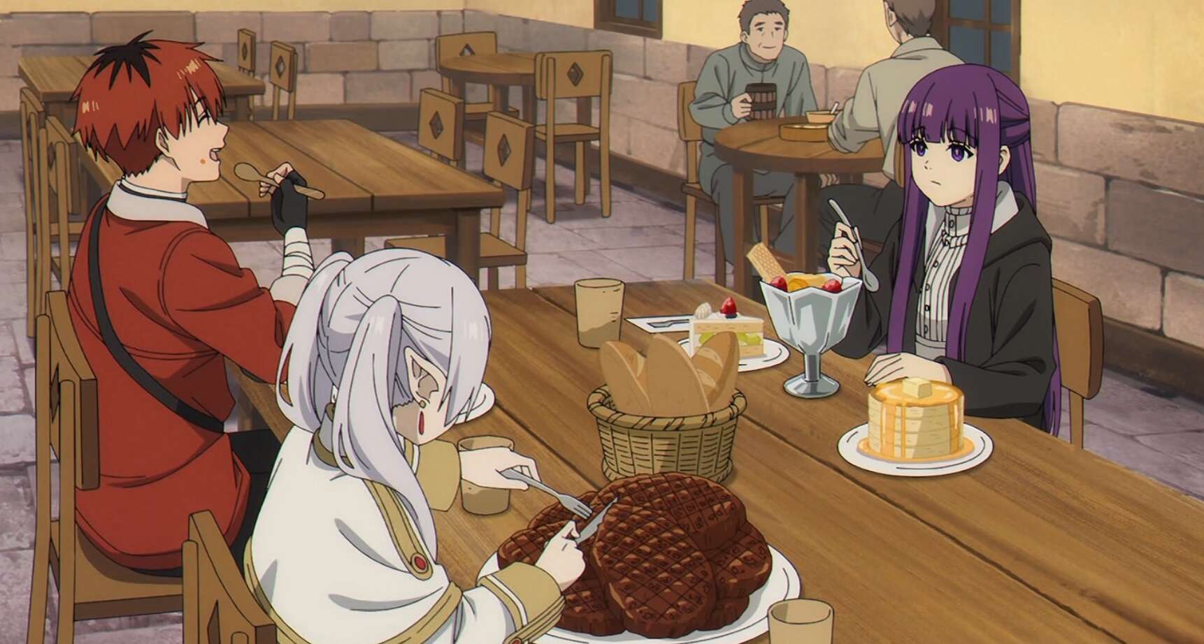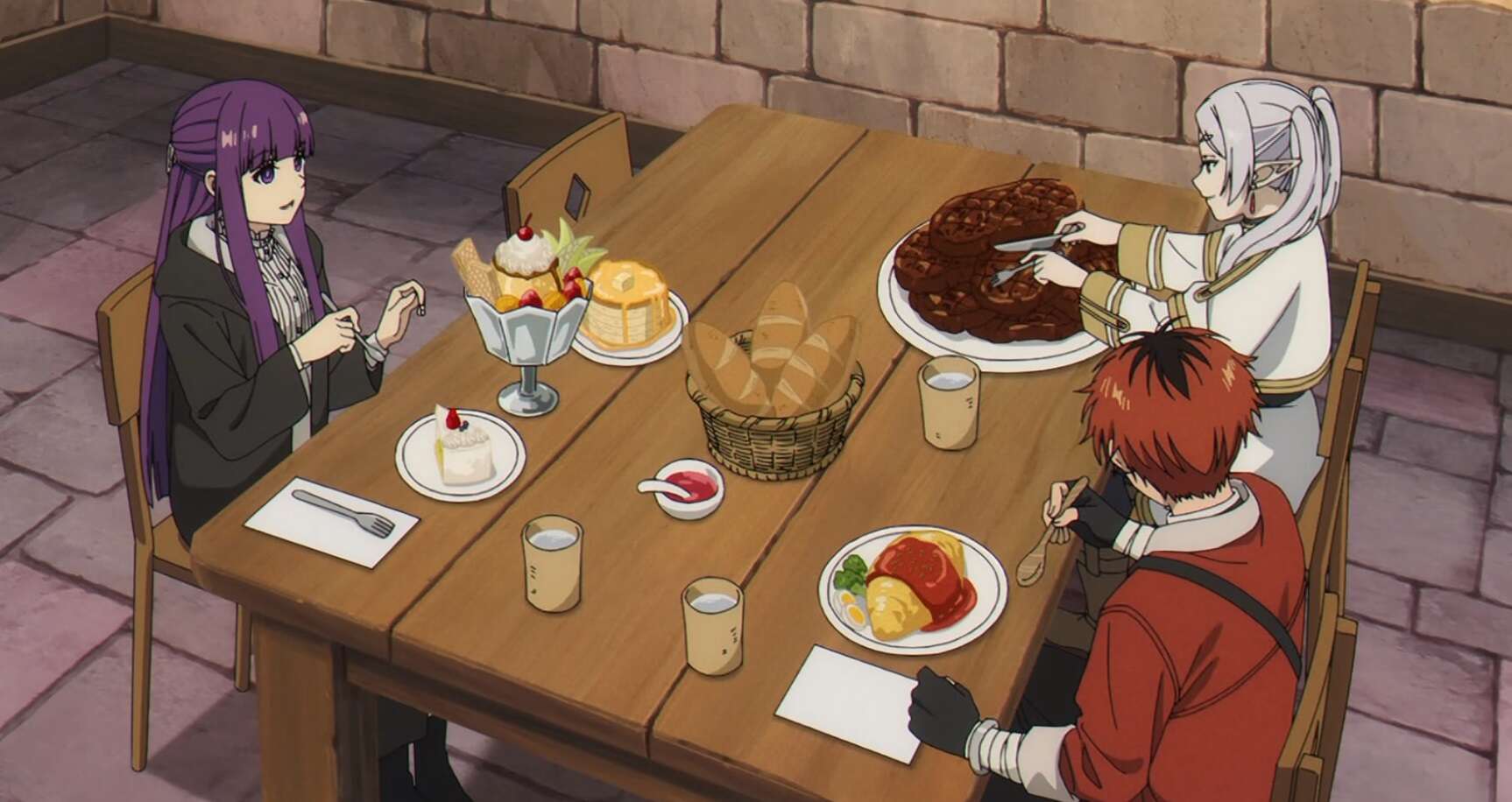 デンケン達が飯屋にたどり着くと、そこの飯屋にはフリーレン達もいました。デンケンが生前の奥さんと一緒に来た飯屋とフリーレンがヒンメル達と行った飯屋は、同じ飯屋でした。フリーレンはフェルンのご機嫌を取るため、デザートをいくらでも頼んでいいとフェルンに言います。そして食事が運ばれてきますが、フリーレンは食い貯めする為、凄い量のステーキを注文していました。