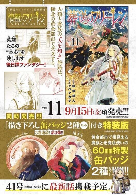 コミックス11巻は9月15日ごろ発売、とこちらもあわせて公式や2023年35号で告知がありました。長期休載しているので、まだまだ先かな?と思っていましたが、こちらも9月29日のTVアニメ 葬送のフリーレンの第1話放送にあわせて、コミック11巻も9月に発売されるようです。これで黄金郷のマハト編を最後まで見ることが出来ますね。