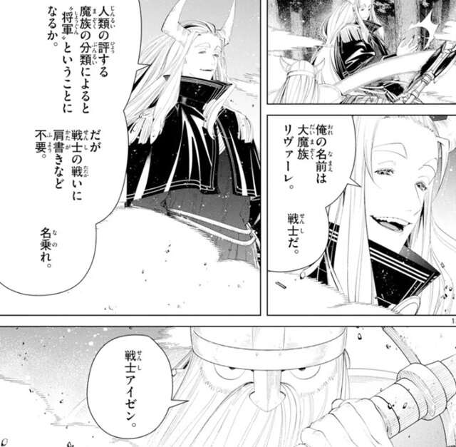 リヴァーレはアイゼンを見事と称賛し、自分の拳を止められたのは一世紀振りだと言います。そして、自分は大魔族リヴァーレ、戦士だ、人類の評する魔族の分類によると“将軍”ということなるか、と自分から名乗ります。そして戦士の戦いに肩書など不要と言い、アイゼンになるように言うと、アイゼンは、戦士アイゼン、と短く答えます。リヴァーレはアイゼンの事を知っているようで、アイゼンをリヴァーレが知る限り人類で最も強い戦士と評します。アイゼンの獲物が斧だと確認するとリヴァーレも魔法で斧を出し、斧で戦おうとします。そして、誇りに思え、お前の目の前に立ちはだかるのは、魔族最強の戦士だ、と言いアイゼンに斧を構えます。