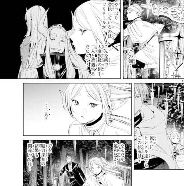先に進んだヒンメル達はソリテールの剣のような武器で攻撃されていますが、何とかかわして女神の石碑を目指しています。フリーレンは剣のような武器から、攻撃しているのがソリテールと分かっているようですが、大魔族級の相手二人と遭遇するだなんて…、と考えた所で違和感を覚えます。魔力探知では二人だけですが、フリーレンは直感で他の魔族がいる事を感じているようです。