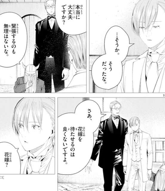 そしてヒンメルが目を覚ますと、既にヒンメル達は魔王を倒していて、平和な世界を取り戻したことになっていました。ヒンメルは最初変だと思いますが、すぐに魔王を倒し平和を取り戻したことに納得します。しかしヒンメルの変な様子から、アイゼンから緊張するのも無理はないと言われます。ここでよく見ると、ヒンメルは正装をしていて、ハイターとアイゼンも正装をしています。そして、花嫁を待たせるのは良くないですよ、とハイターはヒンメルに言いますが、ヒンメルは訳が分からず戸惑います。