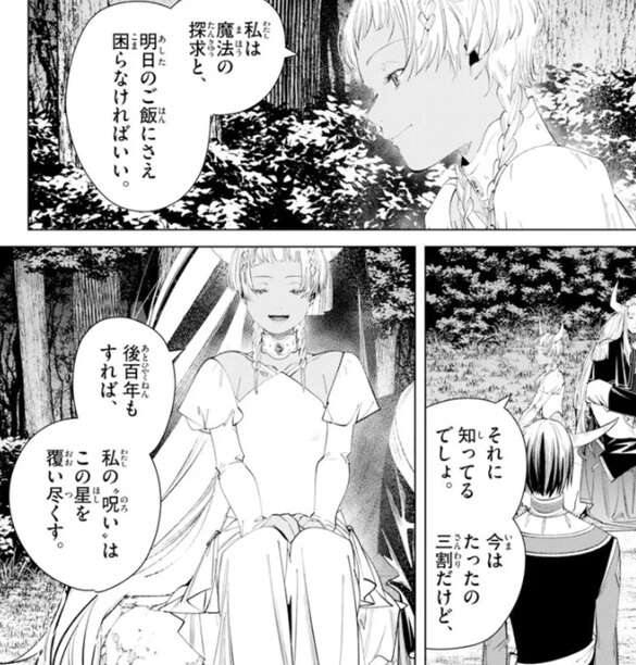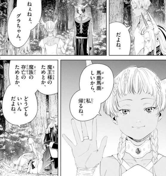 今回から大魔族四人との戦闘が始まるかと思いましたが、冒頭の魔族の会議でいきなり終極の聖女トートが馬鹿馬鹿しいと帰っていってしまいます。彼女の“呪い”は後百年ほどで覆われると言っているので、80年後のフリーレンがいた世界は“呪い”でざっと八割がたは覆われていそうです。トートがこのままいなくなるのなら、今回のエピソードではなく先のエピソードで関係してきそうです。