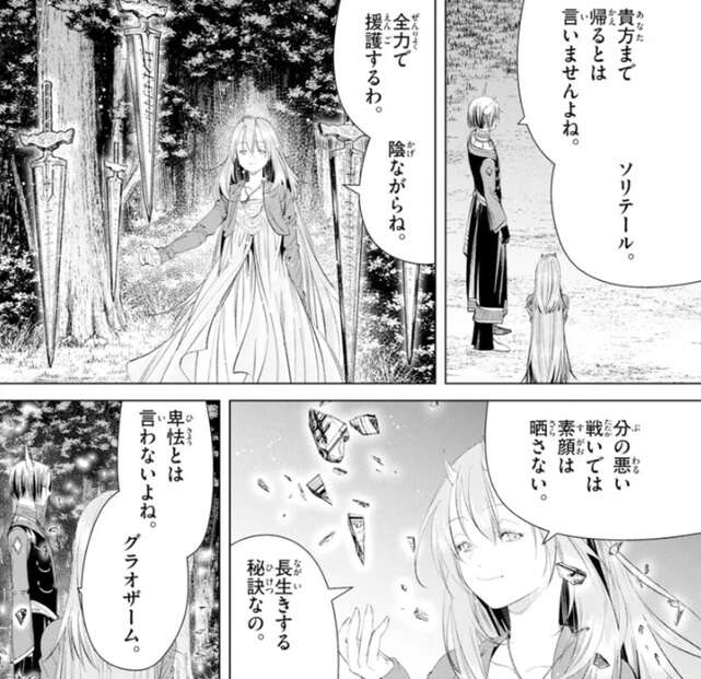 ソリテールは戦闘では援護だけのようで、直接ヒンメル達とは戦わないそうです。もし直接戦ってソリテールが死んでしまうと、マハトとの戦いやヴァイゼを黄金郷から解放した出来事に影響が出そうなので、今回はソリテールが死ぬことはないでしょう。