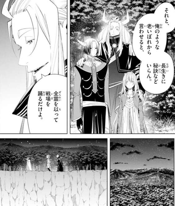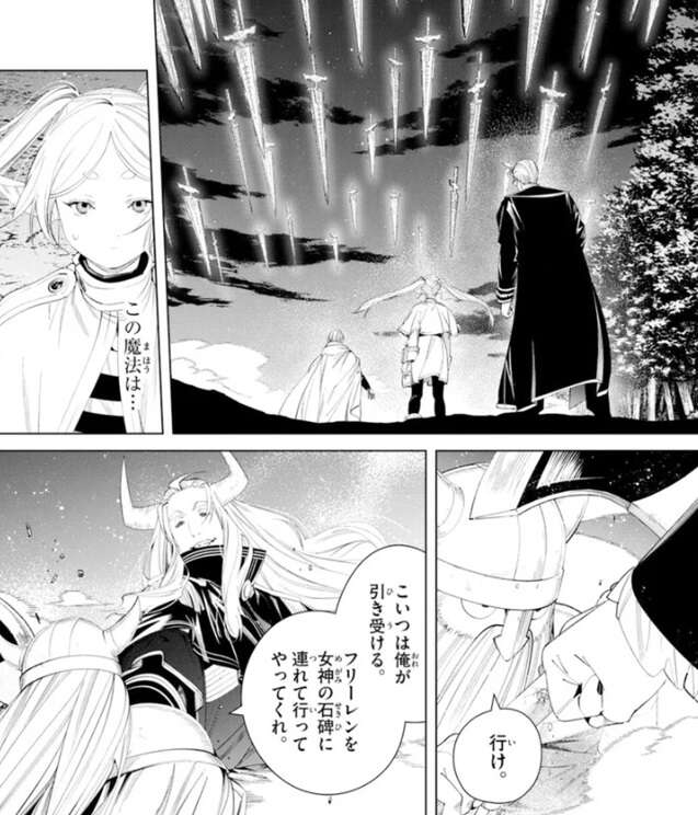 ソリテールとグラオザームは言い争いのような形になりますが、結局リヴァーレが先陣を切る形で話は落ち着きます。リヴァーレはかなり長生きしているようで、自分を老いぼれと呼び、長生きに秘訣などいらん、全霊を以って戦場(いま)を踊るだけよ、と二人に言います。一方、ヒンメル一行は女神の石碑のある場所まで戻ってきていました。ヒンメルが休憩しようと言いますが、フリーレンは強大な魔力の反応に気付きます。しかし、フリーレンの予想より遥かに早く、魔力の反応は近づいてきます。