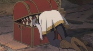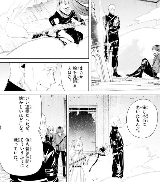 シュタルクは斧でラダールのナイフを破壊すると、ラダールは破壊されたナイフを捨て、すぐに別のナイフを取り出し、シュタルクの胸ぐらを掴むとそのままナイフでシュタルクを刺そうとします。しかし、ラダールがシュタルクにナイフを刺すより先に、フェルンが魔法でラダールのナイフを破壊します。ラダールは、俺も本当に老いたもんだ、とつぶやくと、フェルンとシュタルクの連携を褒めます。