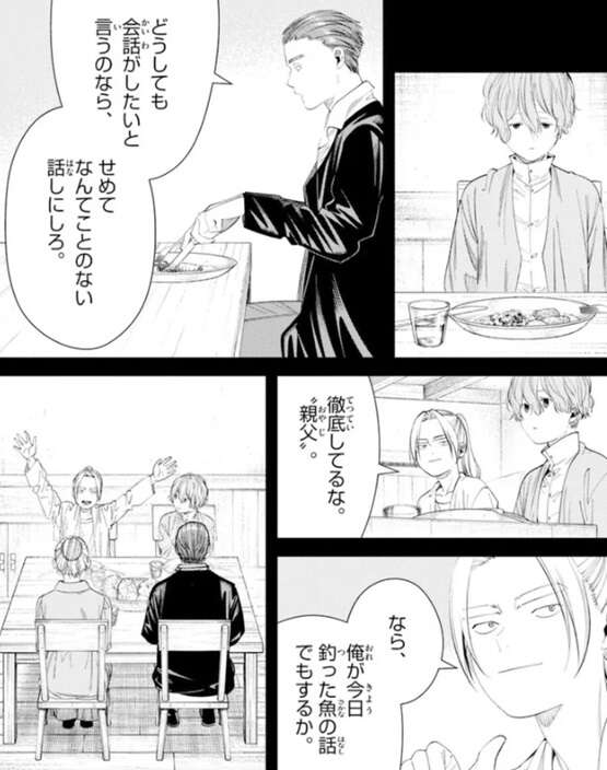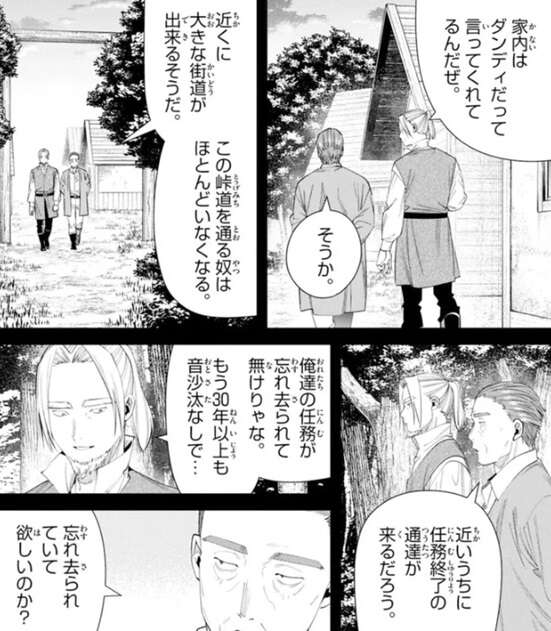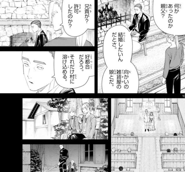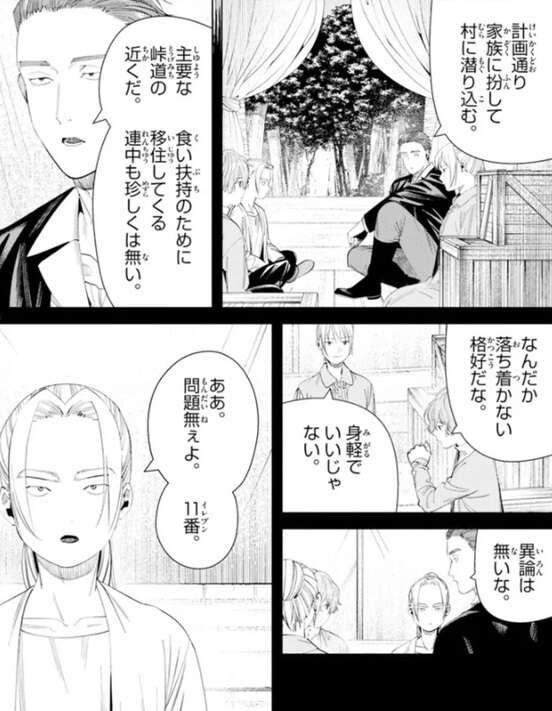 フリーレンはラダールに私の命を狙った理由を言うように迫りますが、そんなの俺が知りたいくらいだよ、とラダールは答えます。そしてこの極秘任務を受けて、どのようにこの村で過ごしてきたかを話し始めます。前回、極秘任務を命じられた四人の戦士は家族に扮して村に潜り込みました。ラダールは末子として、他の戦士はそれぞれ父親、母親、ラダールの兄として役を演じました。ラダールが父親役の戦士に、ああ問題無ぇよイレブン、と言うと、“親父”だ、と父親役の戦士は注意します。