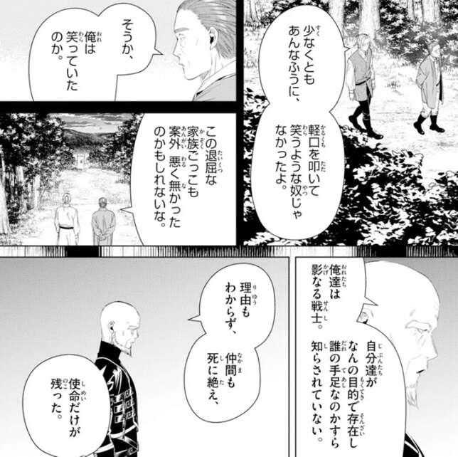 その様子を見てラダールは、あんたは俺の知る限り最も冷酷で任務に忠実な戦士だった、少なくともあんなふうに、軽口を叩いて笑うような奴じゃなかったよ、と言います。自分が笑っていた事に気付いた父親役の戦士は、この退屈な家族ごっこも案外悪く無かったのかもしれないな、とラダールにつぶやきます。場面は現在に戻りラダールは、自分達は影なる戦士で、目的も誰の手足なのかも知らない、とフリーレンに言います。ラダールは理由も分からず、仲間も死に絶え、使命だけが残った現状に複雑な思いを抱いているようです。そして、3年前に死んだ最後の仲間、兄貴役の戦士を看取った時の事を語ります。