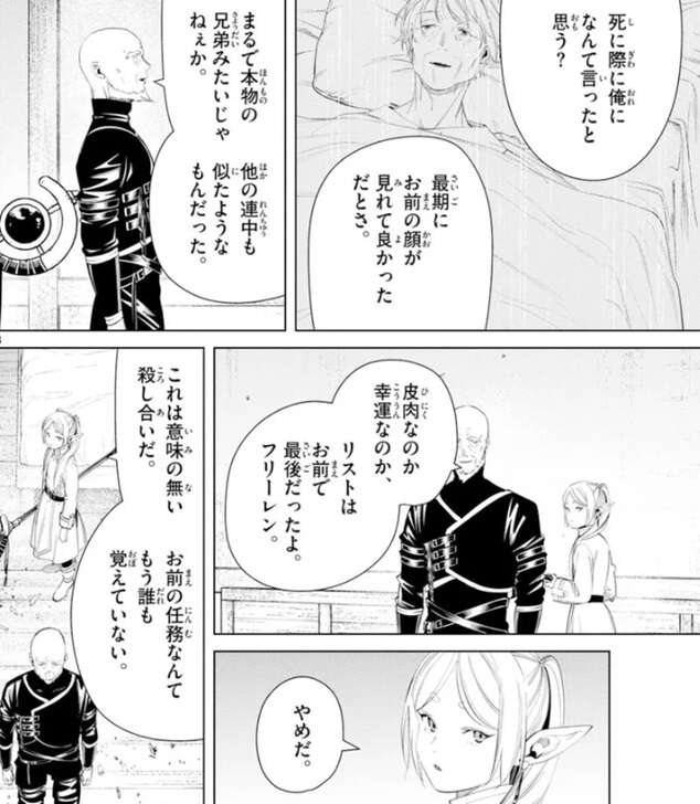 大往生だったようで、最後にお前の顔が見れてよかった、と死に際にラダールに言ったそうです。まるで本物の兄弟みたいじゃねぇか、他の連中も似たようなものだった、とラダールはつぶやきます。そして、リストの最後がフリーレンだったとラダールが言うと、これは意味の無い殺し合いだ、お前の任務なんてもう誰も覚えていない、とフリーレンは言い戦いを止めます。