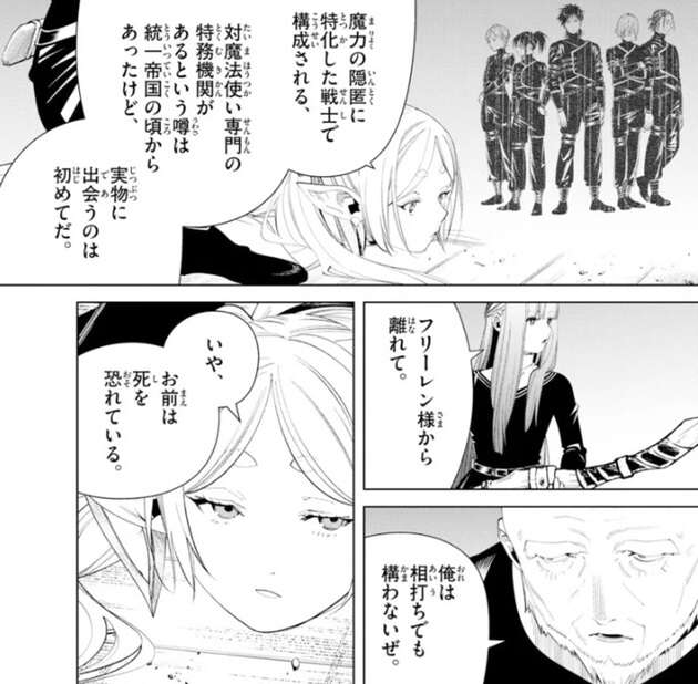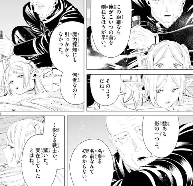 部屋に乱入してきたラダールにフリーレンは魔法を放ちますが、ラダールはフリーレンの腕を掴んで魔法の方向をそらすと、フリーレンの体を拘束しナイフを首に当てます。フェルンは杖をラダールに向けて動かないように言いますが、この距離なら俺がこいつの首を刎ねる方が早い、とラダールは言い、そうだね、とフリーレンも答えます。フリーレンの魔力探知にも引っかからなかったようで、フリーレンは何者か尋ねます。ラダールは、数ある影の一つよ、と言い名乗る名前は無いと答えます。フリーレンは影なる戦士の事を知っているようで、魔力の隠匿に特化した戦士で構成される、対魔法使い専門の特務機関の噂の事を話します。