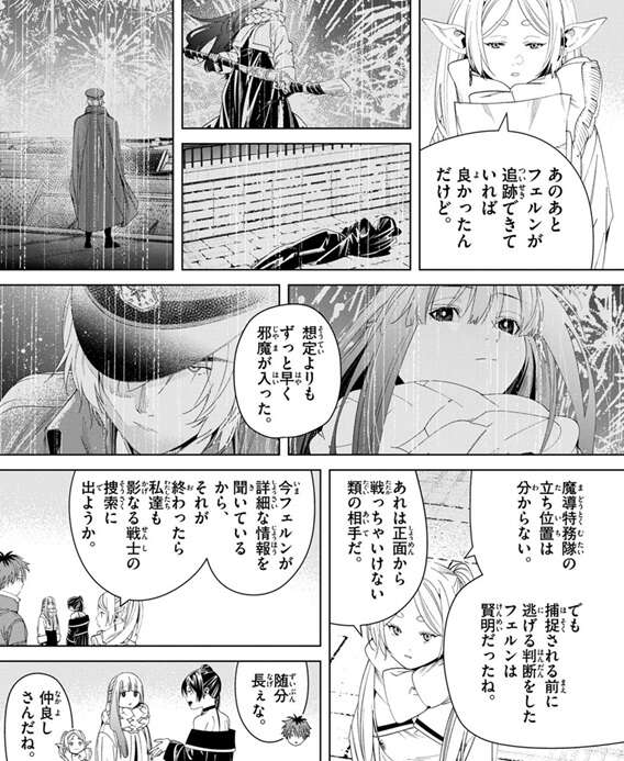 シュタルクはこの人相書きだけで影なる戦士を探すのか?とフリーレンに聞き、舞踏会は明日なんだからそれまで潜伏してるんじゃねぇか、とシュタルクは言いますが、フリーレンは、指示を出したゼンゼに言うべきだね、と答えます。ロレの魔力探知も市街戦の後は引っかからないようで、さらにフェルンは追跡しようとしたようですが魔導特務隊の邪魔が入ったようで、フェルンも魔力探知は出来ていません。