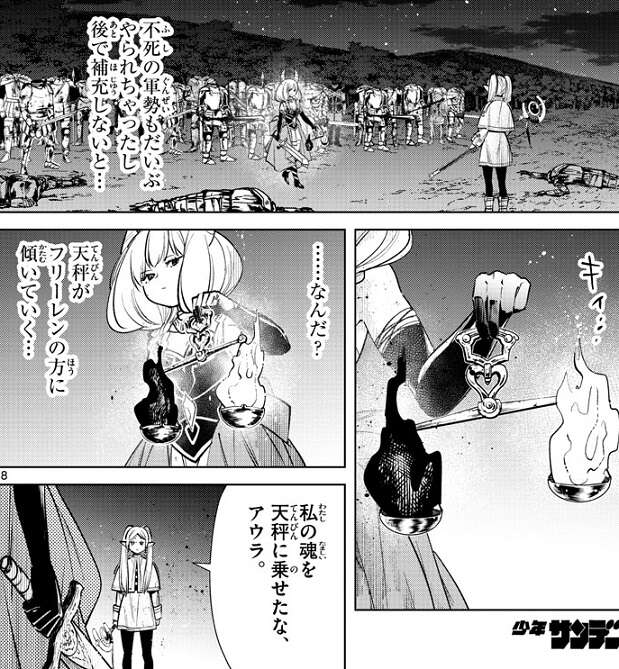 場面は再びアウラとの戦いに戻り、フリーレンとアウラから魂が出て服従の天秤の上に乗ります。アウラはフリーレンの魔力を見て、優秀な魔法使いだけれども魔力自体はそれほどでもない、と自分には遠く及ばないと確信します。