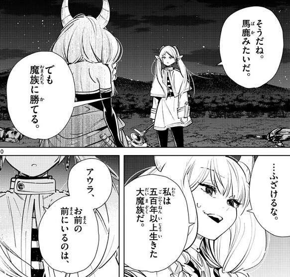 そうだね、馬鹿みたいだ、でも魔族に勝てる、とフリーレンが言うと、…ふざけるな、私は五百年以上生きた大魔族だ、と表情をこわばらせながらアウラは言います。アウラ、お前の前にいるのは、千年以上生きた魔法使いだ、と言うとフリーレンは魔力の制限を開放します。するとアウラの持つ服従の天秤は、完全にフリーレンの方に傾きます。