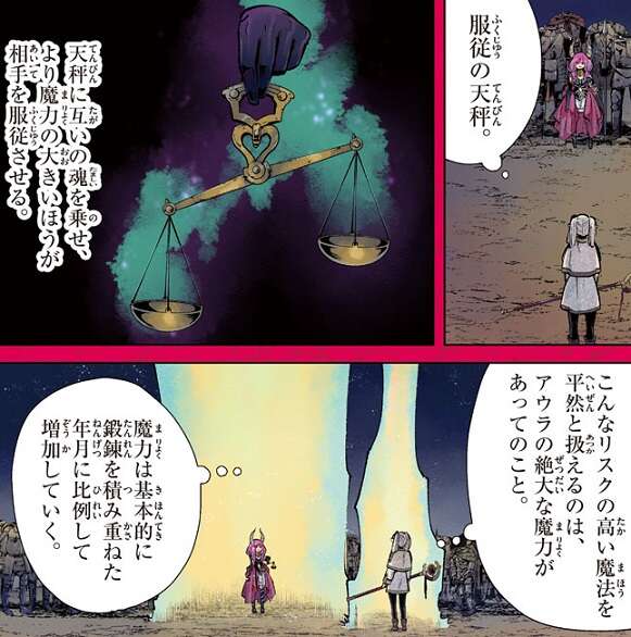 フリーレンは服従の天秤を手にするアウラと対峙します。服従の天秤とは、天秤にお互いの魂を乗せ、より魔力の大きいほうが相手を服従させることが出来るものです。こんなリスクの高い魔法を平然と扱えるのは、アウラの絶大な魔力があってのこと、とフリーレンは思います。