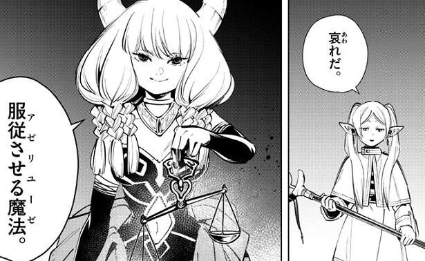 アウラは五百年以上生きた大魔族であること、その生涯のほとんどを鍛錬に費やしたこと、体外の魔力の量だけでもフリーレンはこれだけの情報が手に入れます。それでも魔族は魔力を包み隠さないし、包み隠せない魔族に、哀れだ、とフリーレンはつぶやきます。そしてアウラは、服従させる魔法(アゼリユーゼ)を唱えます。