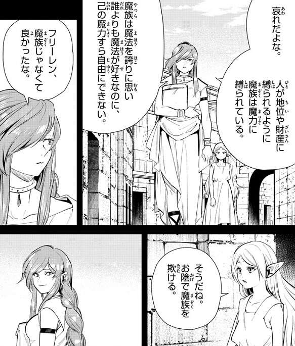 そして魔族にとっては強い奴が偉いと言い、奴らにとっての魔力は人にとっての地位や財産だ、尊厳そのものと言ってもいい、フランメはフリーレンに教えます。そして力の強い魔族ほど必死に魔力を誇示するんだ、と言い、奴らにとっては常に魔力を制限するメリットなんて皆無だし、そもそもそんな発想すらない、と魔族が常に魔力を常に制限しない理由をフリーレンに教えます。そして、哀れだよね、人が地位や財産に縛られるように魔族は魔力に縛られる、とフランメは魔族を哀れみ、フリーレンに、魔族じゃなくて良かったな、と話しかけます。フリーレンは、そうだね、お陰で魔族を欺ける、と答えると、そんなフリーレンを見てフランメは、魔力の制限を始めてから3年か…、私の見込みは間違っていなかったな、と言います。