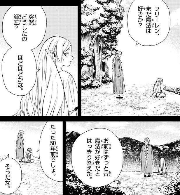 そしてさらに50年が経過し、フリーレンは魔力の制限がだいぶ様になってきます。年老いたフランメから、まだ魔法は好きか?と問われ、突然どうしたの師匠?ほどほどかな、とフリーレンは質問に答えます。お前はずっと昔、魔法が好きだとはっきり答えた、フランメが教えると、たった50年前でしょ、とフリーレンは答えます。そして、結局私はお前に戦いのことしか教えなかった、復讐のための魔法だ、とフランメが言うと、後悔しているの?と、フリーレンがフランメに聞きます。フランメは否定し、お前に私の魔法を託してよかったと思っている、お前の長い寿命ならいつか魔王を倒せるほどの高みにたどり着けると、フランメは語ります。