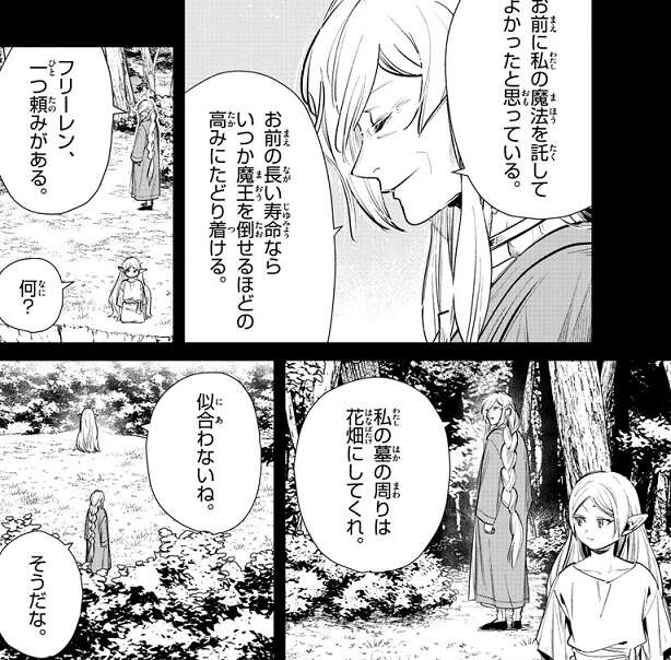 突然、フランメはフリーレンに、私の墓の周りは花畑にしてくれ、と頼みごとをします。フリーレンが、似合わないね、と言うと、そうだなと言いつつ、私の一番好きな魔法は、綺麗な花畑を出す魔法だ、とフランメは一番好きな魔法の事をフリーレンに教えます。