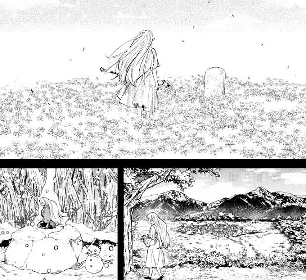 その後、フリーレンは綺麗な花畑を出す魔法をフランメに教えてもらったのか、フランメの墓の周りを花で埋め尽くします。フリーレンはそれからも変わらず町から離れた森の中で一人目立たず魔法の修行を行いながら暮らします。
