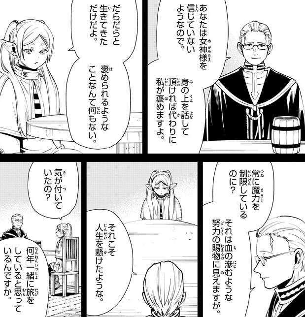 そして、フリーレンが女神様を信じないというのなら俺がお前を褒めてやる、とクラフトは言い、フリーレンに身の上を話すように言います。フリーレンは、俺がお前を褒めてやる、という言葉からハイターの事を思い出します。ヒンメルとまだ旅をしていた頃、ハイターが村の孤児院の復興資金を出した事を意外だ、とフリーレンが話しています。すると、突然ハイターが、あなたには褒めてくれる人はいますか?と、フリーレンに質問してきます。フリーレンが女神様を信じていないようなので、身の上を話して頂ければ代わりに私が褒めますよ、とハイターはクラフトと同じようなことを言います。ハイターはフリーレンが常に魔力を制限している事、血の滲むような努力の賜物に見えますが、と指摘すると、フリーレンは面白い話じゃないよ、と言います。