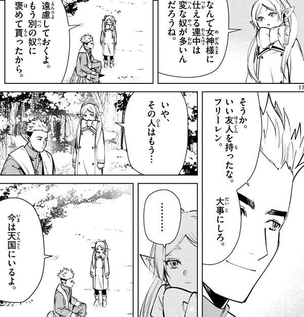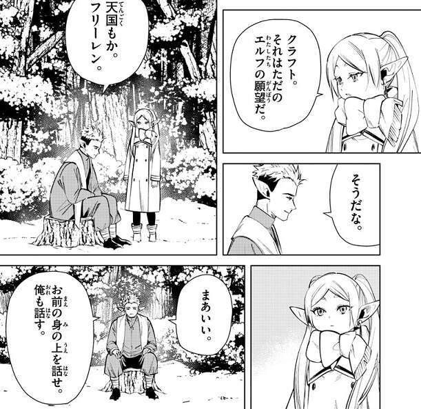 フリーレンの回想は終わり、クラフトに遠慮しておくよ、もう別の奴に褒めてもらったから、と言います。そうか、いい友人を持ったな、フリーレン、大事にしろよ、とクラフトが言うと、フリーレンは、いや、その人はもう…、と言ったところで少し何かを考えます。そしてフリーレンは、今は天国にいるよ、とクラフトに言います。