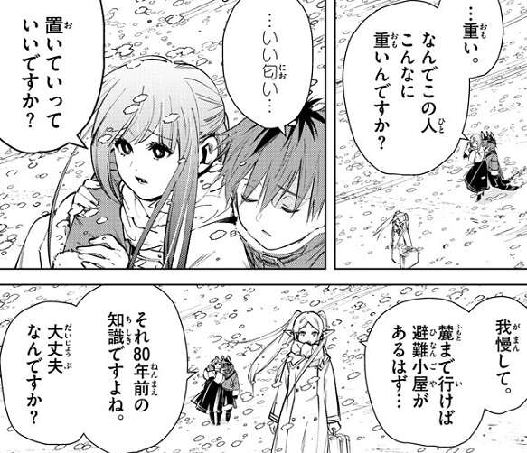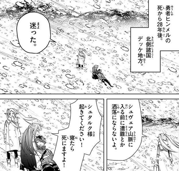 勇者ヒンメルの死から28年後、北側諸国、デッケ地方でフリーレン達三人は吹雪の中、雪山で遭難してしまいます。シュタルクは寒さのあまり眠ってしまい、フェルンが必死に起こそうとしています。しかし、既にシュタルクの意識はほとんどなく、フェルンが担いでいくしかありません。