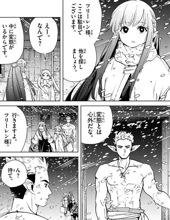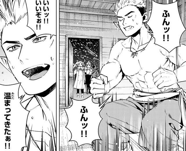 フリーレンに他を探しましょう、中に変態がいるから、とフェルンが説得していると、中から上半身裸のエルフが出てきます。フリーレン達を中に招き入れ火をつけて全員で暖を取ります。エルフは武道僧(モンク)のクラフトと名乗り、シュヴェア山脈を越えてきたがこの吹雪で火種を失ってしまった、凍える小屋の中でスクワットをして命を繋いでいた、とフリーレン達に説明します。