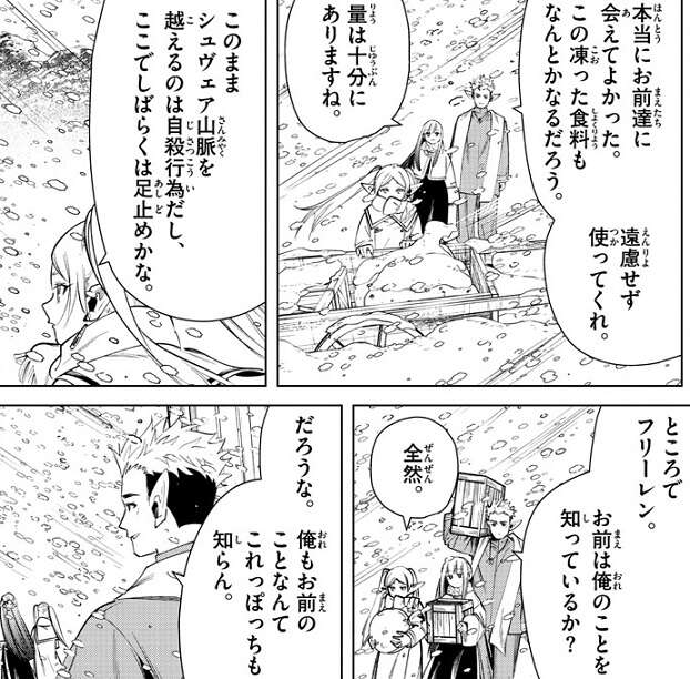 クラフトが持っていた食料を回収しますが、このままシュヴェア山脈を越えるのは自殺行為とフリーレンは判断し、ここにしばらく留まることを余儀なくされます。クラフトは、お前は俺のことを知っているか?と、突然フリーレンに聞きます。全然、とフリーレンが答えると、だろうな、俺もお前のことなんてこれっぽっちも知らん、とクラフトは言います。勇者様御一行の魔法使いですよ、とフェルンが言っても、クラフトはその前は?と聞いて全く興味がありません。クラフトに言わせると、これがエルフというものだそうです。