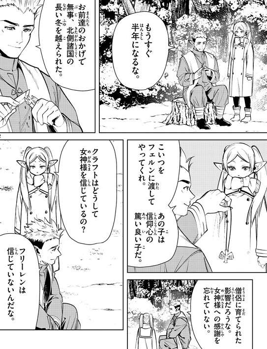 そして半年が経ちクラフトは、お前たちのおかげで無事、北側諸国の長い冬を超えられた、とフリーレンに感謝します。クラフトは木を削って作ったペンダントをフェルンに渡してやってくれと、フリーレンに頼みます。フェルンは信仰心の篤い良い子だ、とクラフト言うと、クラフトはどうして女神様を信じているの?と、フリーレンは質問します。