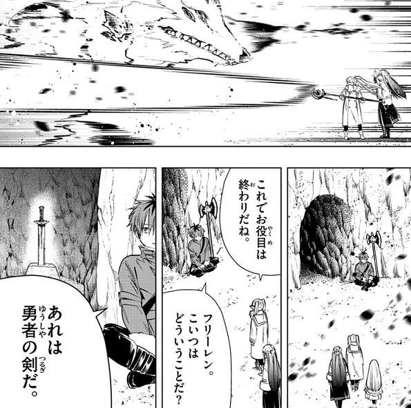 上出来だ、とフリーレンがフェルンに言うと同時に、フリーレンは魔法で山の主を吹き飛ばし、止めを刺します。これでお役目は終わりですが、シュタルクは洞窟の奥に勇者の剣があるのを見つけ、こいつはどういうことだ?と、フリーレンに聞きます。