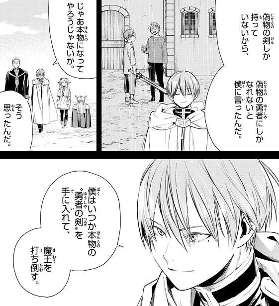 フリーレンはヒンメルが持つ剣が、“勇者の剣”であることに気づきますが、ハイターは偽物だと言います。昔、村に来た行商人を魔物から助けたときにお礼で貰ったもので、未来の勇者にという事で貰った子供騙しのようなものでした。その時、まだ村の孤児院にいた子供の頃のハイターから、偽物の剣しか持っていないから、偽物の勇者にしかなれないと言われ、ヒンメルはいつか本物の“勇者の剣”を手に入れて、魔王を打ち倒す、と思ったのが勇者になったきっかけだそうです。