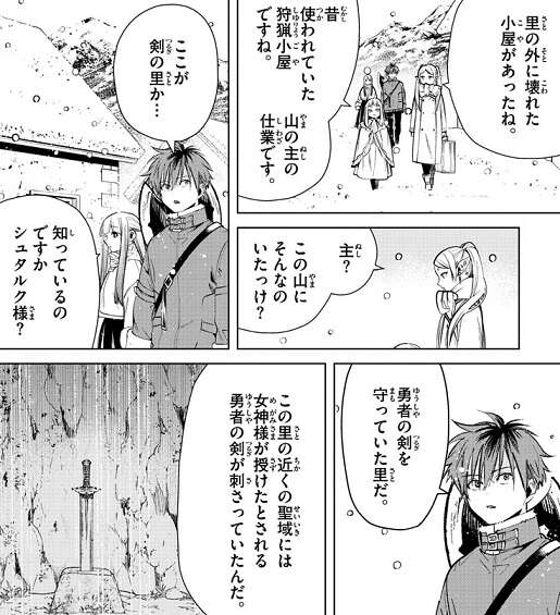 北へ進むと吹雪もだいぶ落ち着いてきて、目的地の剣の里が見えてきます。49代目の里長がフリーレン達を迎えますが、フリーレンが知っている里長とは違うようで、里長に若いねと声をかけます。この剣の里は勇者の剣を守っていた里で、この里の近くに聖域がありそこに勇者の剣が刺さっていたそうです。