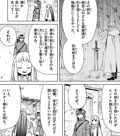 その剣は歴史上のどんな英雄達が引き抜こうとしても微動だにしなかったそうですが、80年前に勇者ヒンメルが勇者の剣を引き抜けたそうです。しかし、フェルンはハイターから勇者の剣の事は何も聞いていなかったそうです。