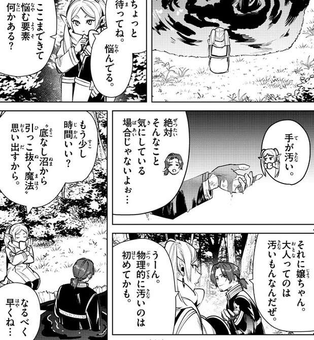 なんで私にそんな話をするの?と、フリーレンが聞くと、男は底なし沼にはまっている最中でした。男はフリーレンに助けを求めますが、フリーレンは手が汚れて汚くなっているのを気にして、乗り気ではありません。時間をかけて“底なし沼から引っこ抜く魔法”を思い出し、フリーレンは男を(時間がかかりましたが)助け出します。
