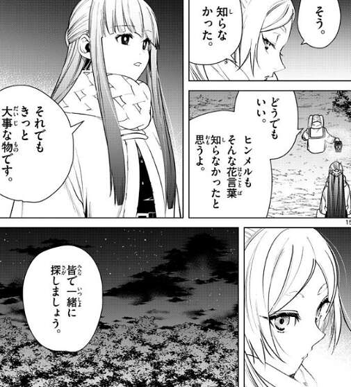 ブレスレットと同じ鏡蓮華の意匠の指輪だったなら、花言葉は久遠の愛情だとフリーレンに教えると、知らなかったとフリーレンは言います。そして、ヒンメルもそんな花言葉知らなかったと思うよ、とフリーレンは気にしない素振りを見せますが、それでもきっと大事な物です、皆で一緒に探しましょう、とフェルンは言います。