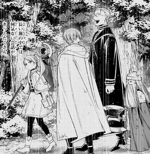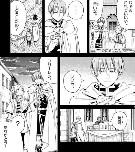 馬車の修理も終わり明日の早朝には出発できると、フェルンはフリーレンに伝えますが、フリーレンは何かを探しています。毎晩探していたようで、フェルンが何を探しているのか聞くと、ヒンメルから貰った指輪だとフリーレンは答えます。それを聞いたフェルンは、手伝います、見つかるまで出発も待って貰いましょう、と言いますが、いいや、今夜見つからなかったら、諦めるよ、失くし物には慣れている、とフリーレンは言います。