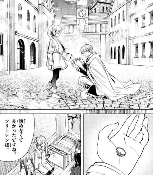 商人にフリーレンが指輪を失くした事を伝えると、言ってくだされば良かったのに、と言い、今回の報酬として渡すつもりだった魔法の一つとして、“失くした装飾品を探す魔法”を商人はフリーレンに渡します。上空から“失くした装飾品を探す魔法”を使って指輪を探し、フリーレンは無事指輪を見つけます。そして、フリーレンはヒンメルから指輪を貰った時の事を思い出します。ヒンメルは今回の討伐依頼で頑張ってくれたから、と好きな物を選ぶようにフリーレンに言います。フリーレンは、じゃあ、これでいいや、と適当に指輪を選びヒンメルに渡すと、ヒンメルは指輪を見て複雑な表情を浮かべます。