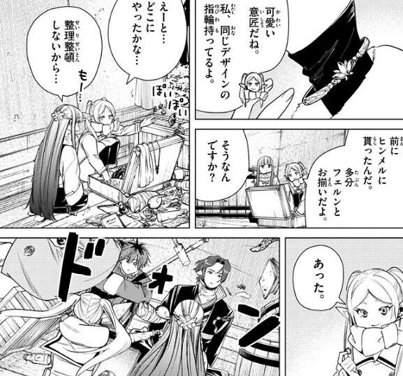北側諸国バンデ森林を進むフリーレン達は、商人の馬車に同乗させてもらっています。フリーレンはフェルンが新しいブレスレットをしているのに気付き、見せてもらいます。フリーレンは同じデザインで前にヒンメルに貰った指輪を持っていると言い、指輪を探しますが整理整頓をしていないのでなかなか見つかりません。