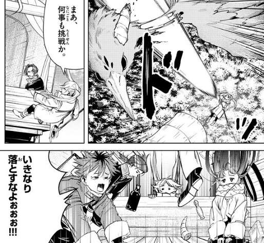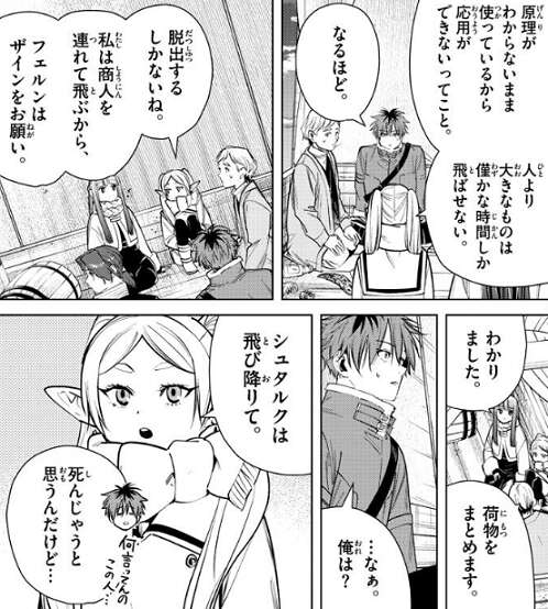 地面に衝突する直前に馬車を浮かせるというのはどうでしょうか?と、フェルンが言いますが、自由落下の威力を殺しきれないとごちゃ混ぜのミンチになっちゃう、とフリーレンは悩みます。しかし、こいつ獲物を地面に叩きつけて狩りをするタイプの魔物だから早くした方がいい、とザインから言われるとフリーレンは鳥形の魔物を魔法で倒し、まあ何事も挑戦か、とフリーレンはつぶやいた後、馬車を魔法で浮かせようとします。