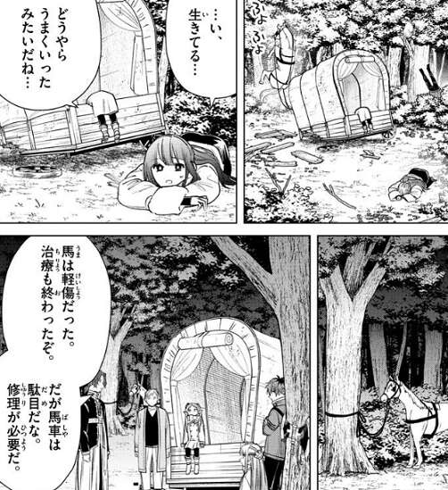 自由落下を始めて馬車は落ちていきます。地面に衝突する直前に馬車を浮かせたおかげで、何とか馬も含めて全員助かりますが、馬車は壊れてしまいます。馬車の修理が必要となり、フリーレン達はしばらく足止めを食らいます。