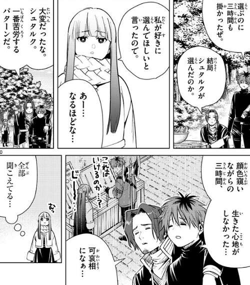 修理をしている間、フェルンがしているブレスレットの話になり、私が好きに選んで欲しいと言ったので、シュタルクが三時間かけて選んでくれたと、フェルンは話します。ザインが、大変だったなシュタルク、一番苦労するパターンだ、と言うと、顔色窺いながらの三時間、生きた心地がしなかった…、と苦労した事をシュタルクはザインに話します。ザインは、あの意匠は鏡蓮華、花言葉は久遠の愛情だ、あれは恋人に贈る物だぜ、と言うと、シュタルクは焦りながら、…し、知らなかったんだ!!と、釈明します。