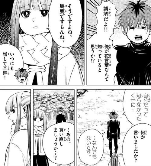 さらに、誤解だよ!!俺が花言葉なんて知っていると思うか!?と、シュタルクが言うと、そうですよね、馬鹿ですもんね、とフェルンはいつにも増して辛辣にシュタルクにツッコみます。シュタルクが、…あの、買い直しましょうか…?と、申し出ますが、ブレスレットは気に入っているようで、これはシュタルク様が一生懸命選んで私にくれた物です、二度とそんなこと言わないで、とフェルンは拒否します。