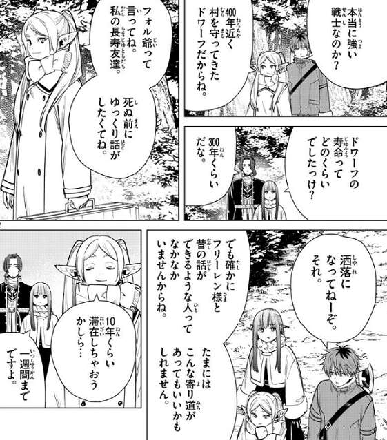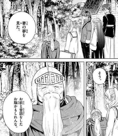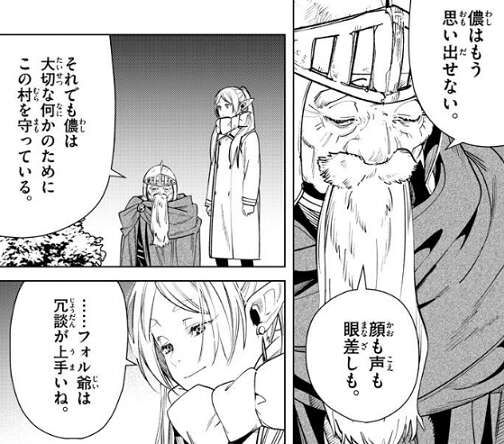 フリーレン達はフォル爺さんという、ドワーフの老戦士に会いに行きます。フリーレンの長寿友達ですが、ドワーフの寿命は300年くらいで400年近く村を守ってきたらしいので、ドワーフから見てもかなりのお年寄りです。80年前、ヒンメルと話した時は妻の顔や声を覚えていたようですが、年のせいか今回フリーレンが訪ねてきた時はもう思い出せなくなっていたようです。しかし、フリーレンと昔話をした事で妻の記憶を思い出せたようで、フォル爺さんにとっては村を守り始めた切っ掛けを思い出せて良かったです。